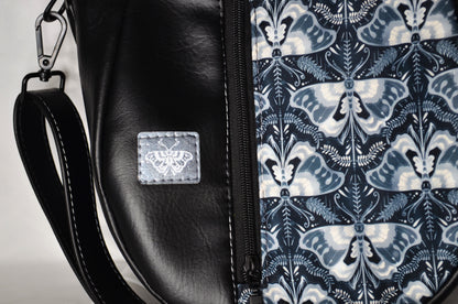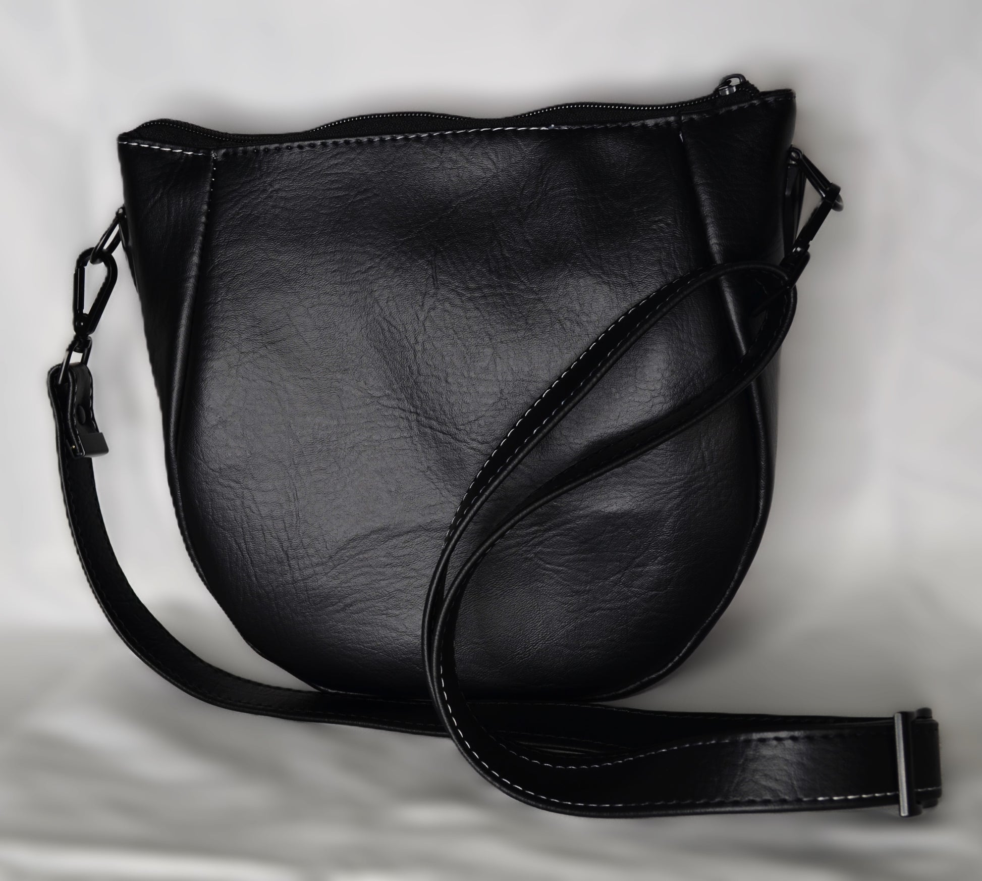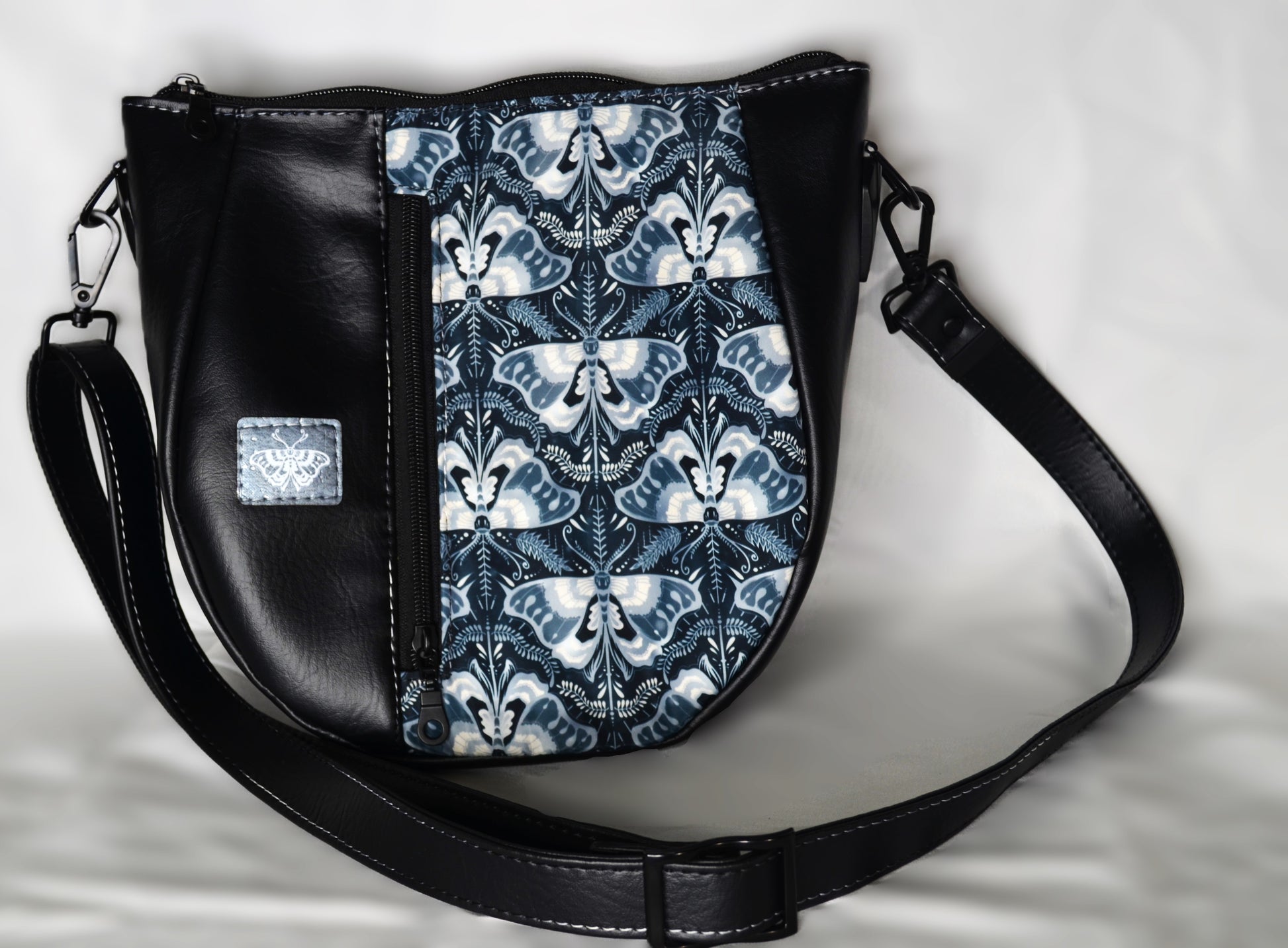 Midsize crossbody with plenty of pockets! Made with faux leather and water-resistant canvas, it measures 7"wide at base, 11"wide at top, 10" tall, and 4" deep at base.