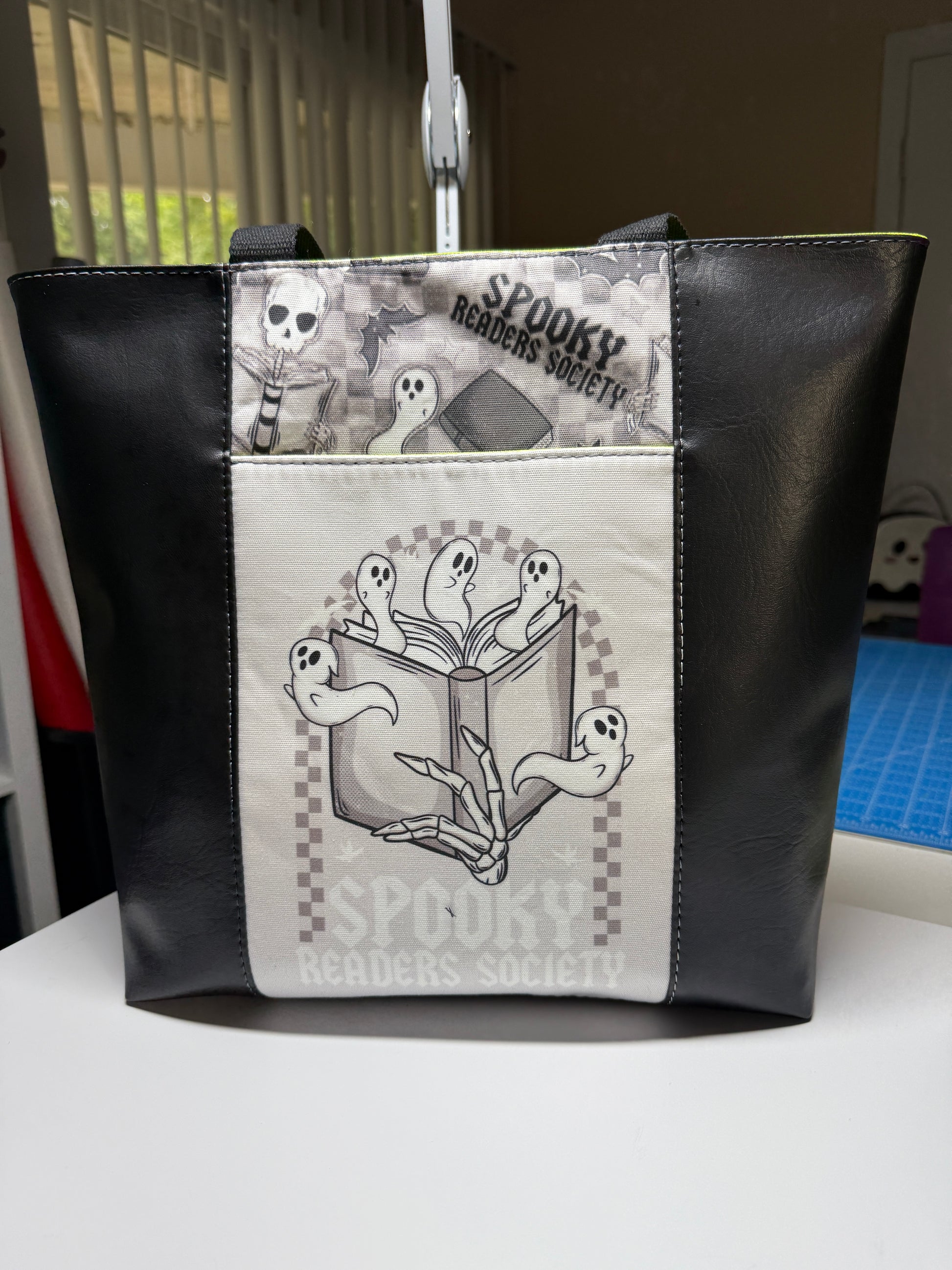 This is a versatile tote featuring at fun theme. Made with Cotton Canvas and Faux Leather. It measures approximately 12" tall, 12" wide and 3" deep. It features one exterior pocket and two interior pockets.