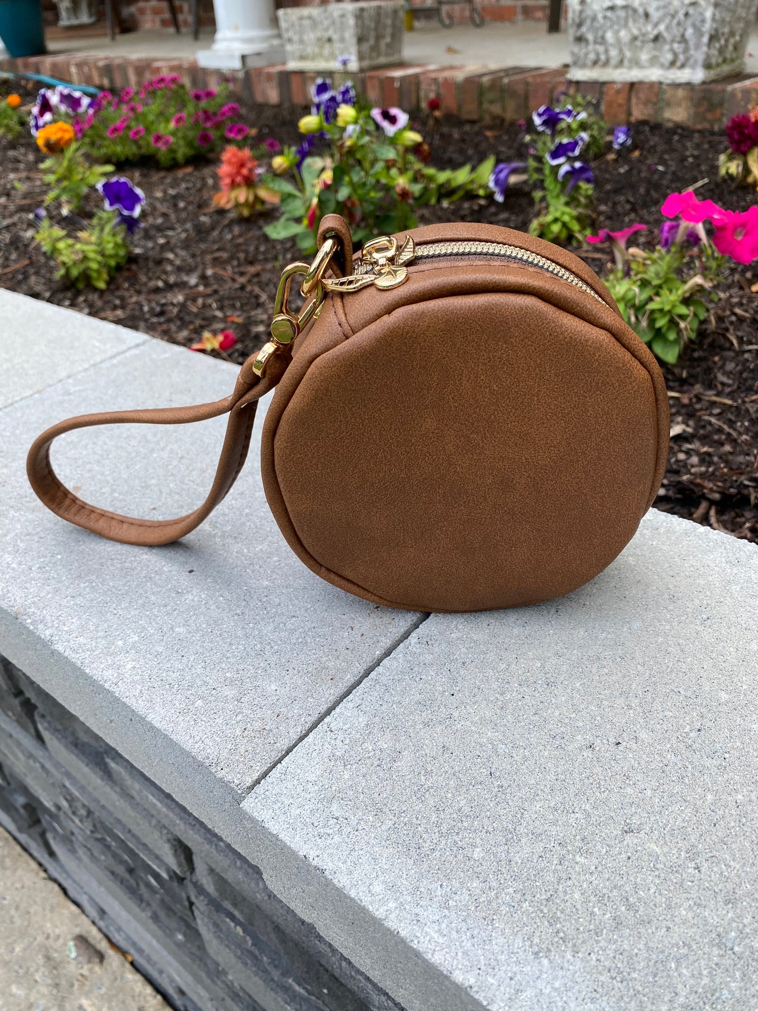 This fun little wristlet is perfect for on the go! Big enough to hold the essentials. It is 5" wide x 5" high and 2" deep. The outside is made with faux leather or vinyl and the inside is made with water resistant canvas.
